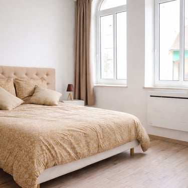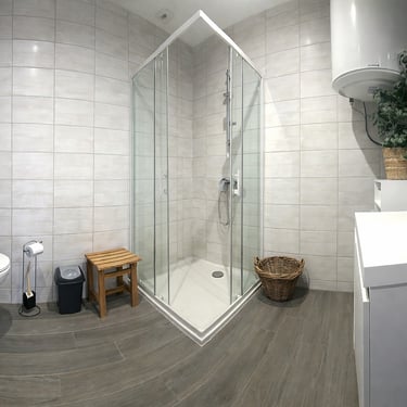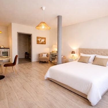 Cet appartement de plain-pied, idéal pour deux personnes, offre un espace lumineux et harmonieux, pensé pour un séjour confortable. La pièce principale combine élégamment un coin nuit avec un grand lit double, et un espace de vie ouvert, créant une atmosphère à la fois chaleureuse et fonctionnelle.