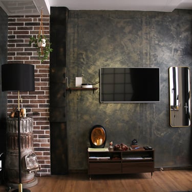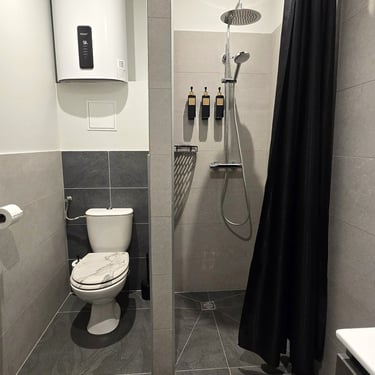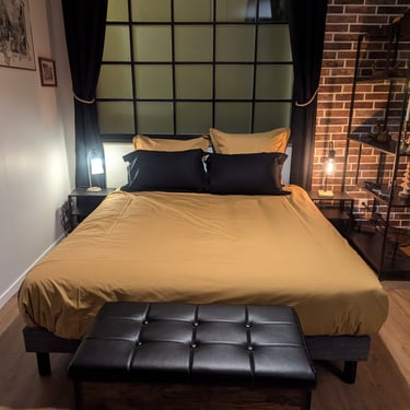 La pièce principale, pensée comme un cocon, se distingue par ses couleurs sombres et son atmosphère intimiste, idéale pour créer une ambiance feutrée en soirée et favoriser le repos.