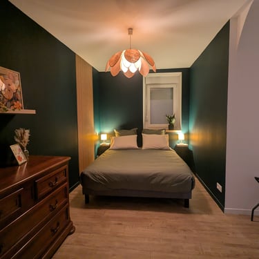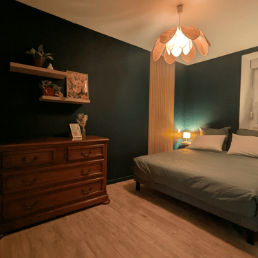 La chambre indépendante, avec un accès direct à la salle de bains, offre un espace nuit intime et reposant. Les couleurs profondes et les éclairages soigneusement choisis créent une atmosphère apaisante, idéale pour se détendre après une journée de découverte.