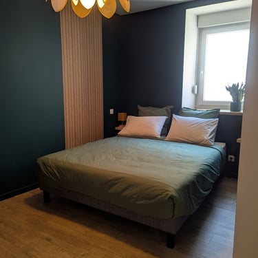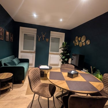 La décoration aux teintes nocturnes et aux matières chaleureuses apporte une identité unique au logement, créant un cocon agréable, parfaitement adapté aux séjours en couple, en famille ou entre amis.